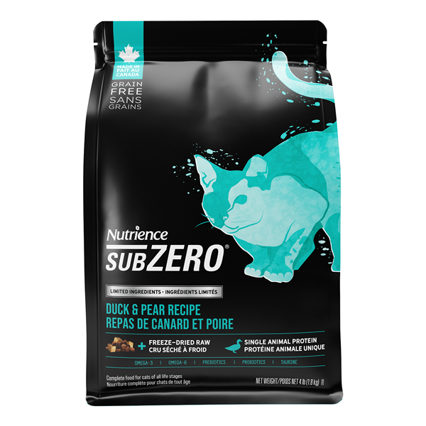 Nutrience SubZero Limited Ingredient Duck & Pear Recipe is formulated to meet the nutritional levels established by the AAFCO Cat Food Nutrient Profiles for all life stages.
