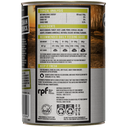 STOCKMAN & PADDOCK WITH 5 KINDS OF MEAT ADULT WET DOG FOOD is formulated to meet the nutritional levels established by the AAFCO Dog Food Nutrient Profiles for All Life Stages.